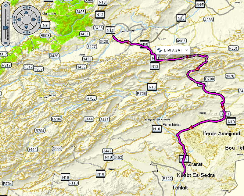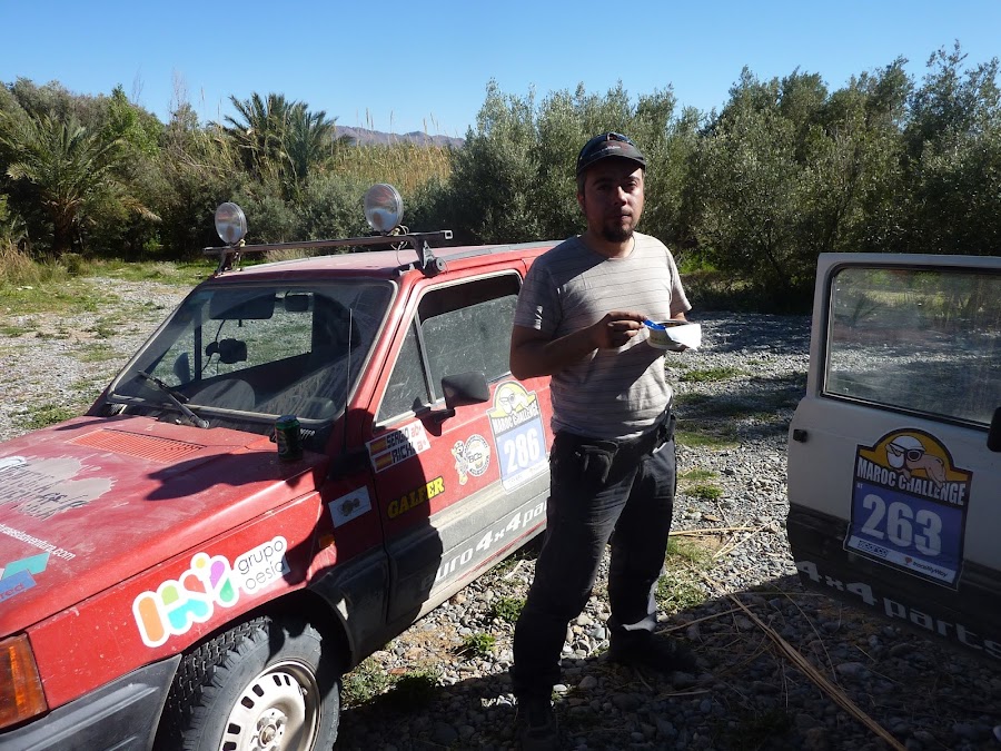Después de bastantes kilómetros de bajada, nos encontramos con el gran problema del día. Nos han dado mal el track del día para el gps, y se corta justo en un pequeño río que tenemos que vadear. Pasamos el río sin problemas y decidimos seguir de frente la pista, dirección sur, en busca de los waypoints restantes. Dentro de la pista, no tuvimos problemas para encontrar dichos waypoints, pero al salir de ella llegamos a un cruce en carretera, que sería el enlace final hasta el camping Karla, cerca de Erfoud. Desde dicho cruce, se podía llegar de dos formas a Erfoud, por el Este, o por el Oeste pasando por Errachidia. Nosotros elegimos la segunda opción, y del cincuenta por ciento de posibilidades que teníamos de acertar... ¡nos equivocamos, ja, ja, ja!. Este hecho nos supuso las dos penalizaciones del día, una por no cumplir con la hora máxima de llegada y otra por no seguir el track. Aunque consideramos que no era culpa nuestra, pues el track estaba cortado, no quisimos reclamar nada puesto que la puntuación no era importante para nosotros. De hecho, al ver que ya no íbamos a llegar en horario, nos paramos a comer tranquilamente ¡sacando nuestro querido jamón, lomo, queso y unas cervezas!.